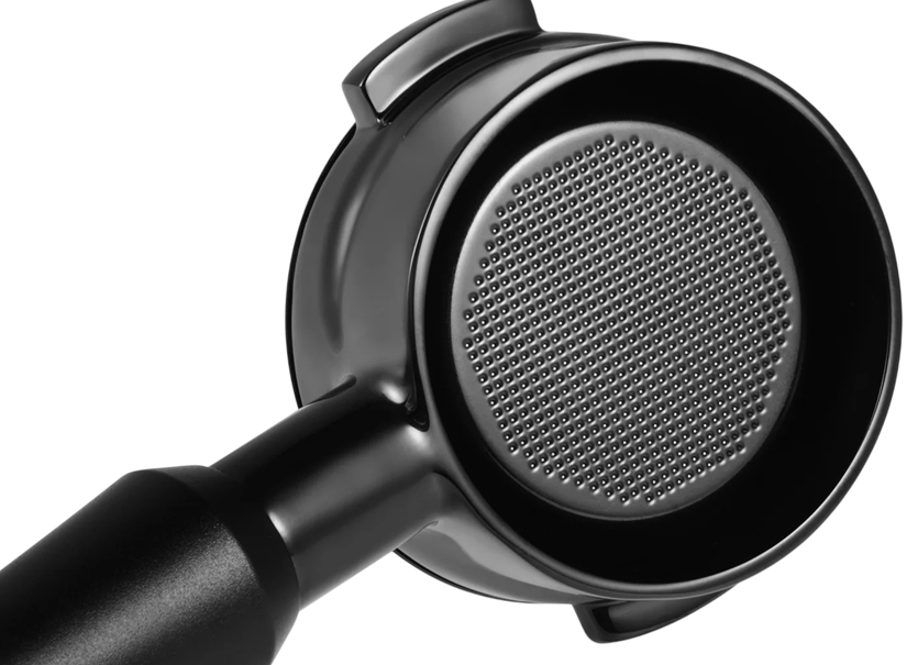 De portafilter is uitgerust met een precisie-gefilterde basket met 632 openingen van 0,30 mm. Deze fijne perforatie zorgt voor een gelijkmatige waterdoorstroming door de koffiepuck en helpt om een stabiele extractie te bereiken. Tegelijk wordt voorkomen dat fijne koffiedeeltjes in de espresso terechtkomen.