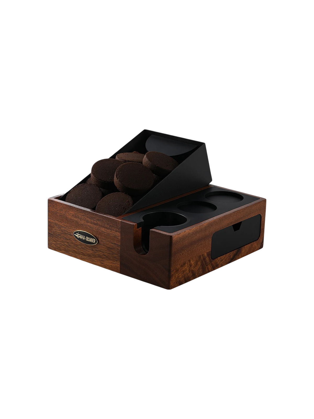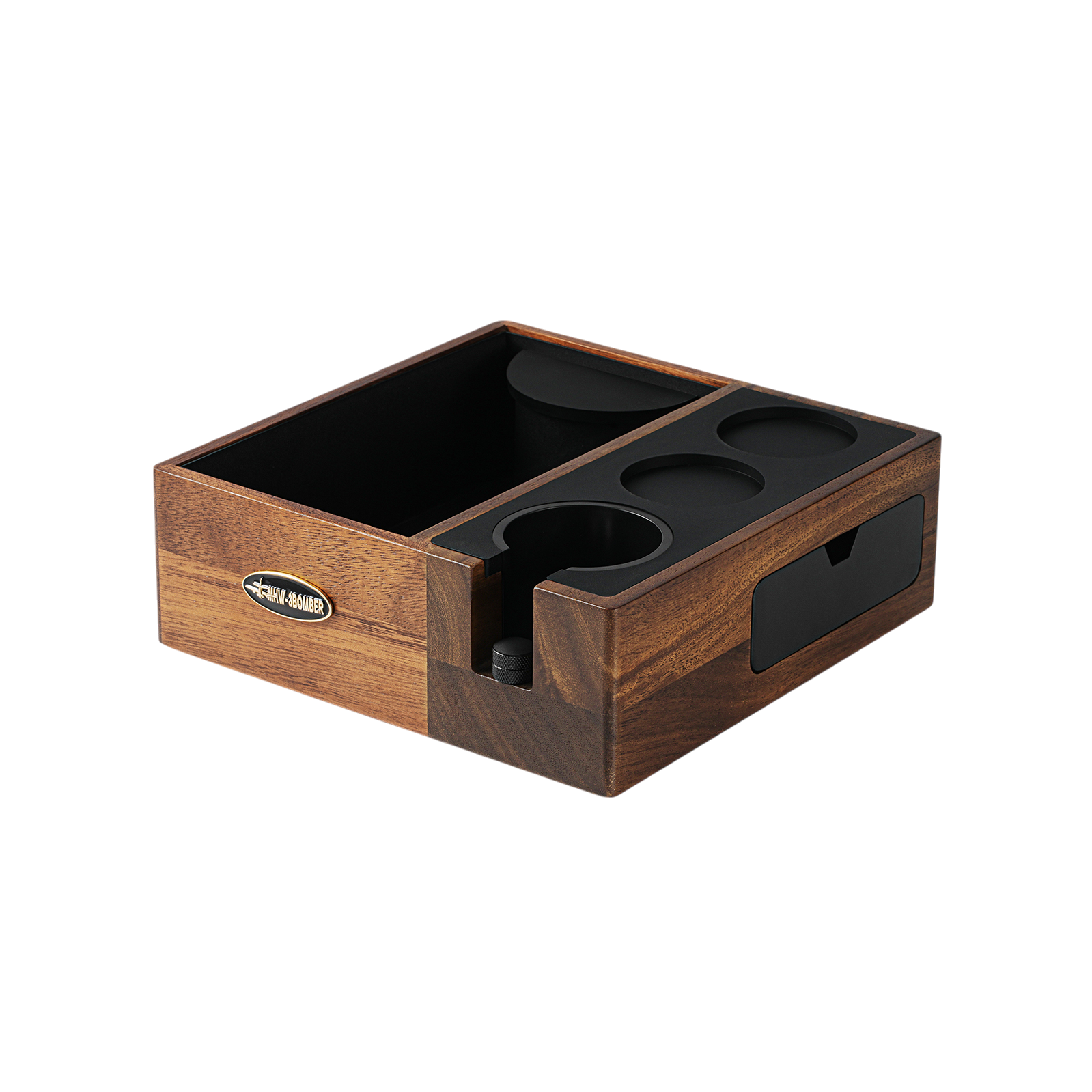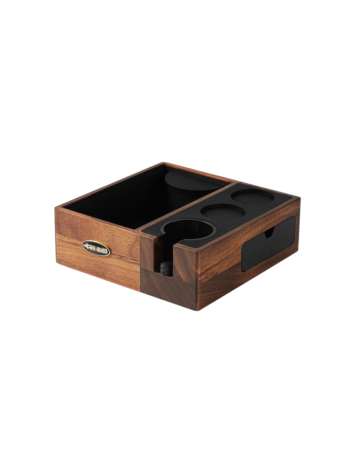 De knockbox biedt een stabiele plek om koffiepucks uit te kloppen en tegelijk accessoires georganiseerd te houden. De houder heeft een inkeping waarin portafilters van 51 mm tot 54 mm stevig passen. Voor 58 mm portafilters kan de cilindervormige inzet worden verwijderd, zodat ook grotere modellen goed ondersteund worden.