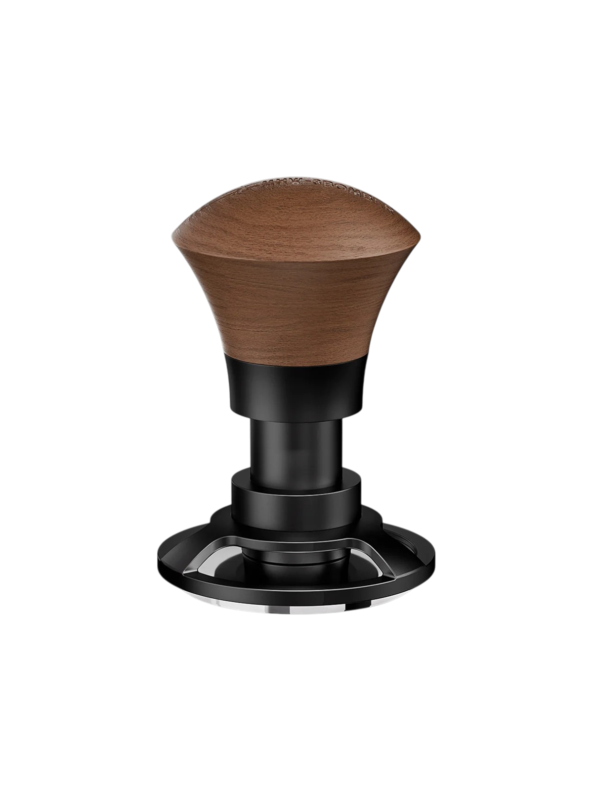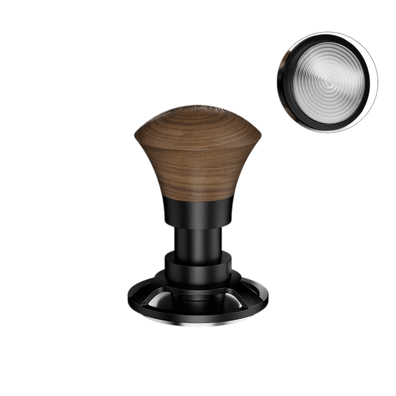 De tampingdiepte is instelbaar tot ongeveer 13 mm, zodat de tamper kan worden afgestemd op verschillende koffiedoseringen en filterdieptes. De constructie combineert roestvrij staal, aluminium en walnoothout, wat zorgt voor een duurzame opbouw en een verfijnde afwerking.