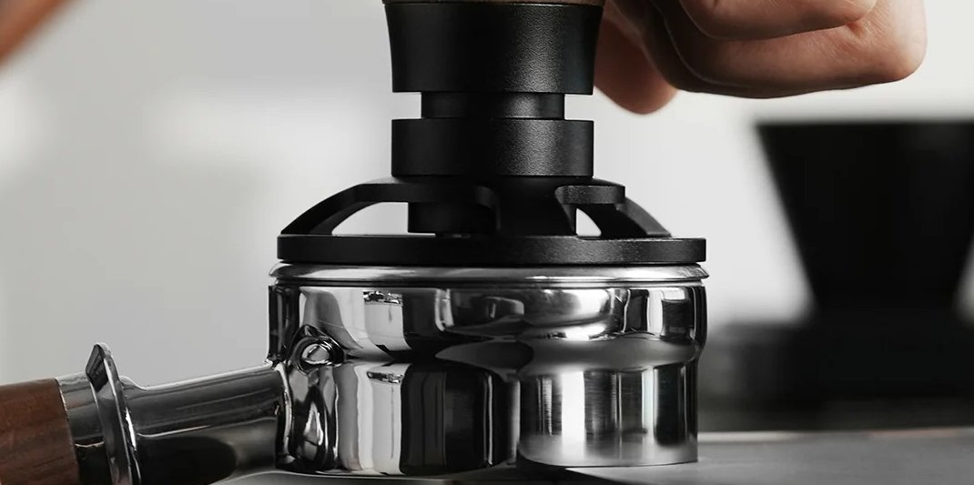 De brede rand van de tamper rust op de rand van het filterbakje en helpt om de tamper recht naar beneden te geleiden. Hierdoor wordt scheef tampen voorkomen en blijft de koffiepuck gelijkmatig aangedrukt.