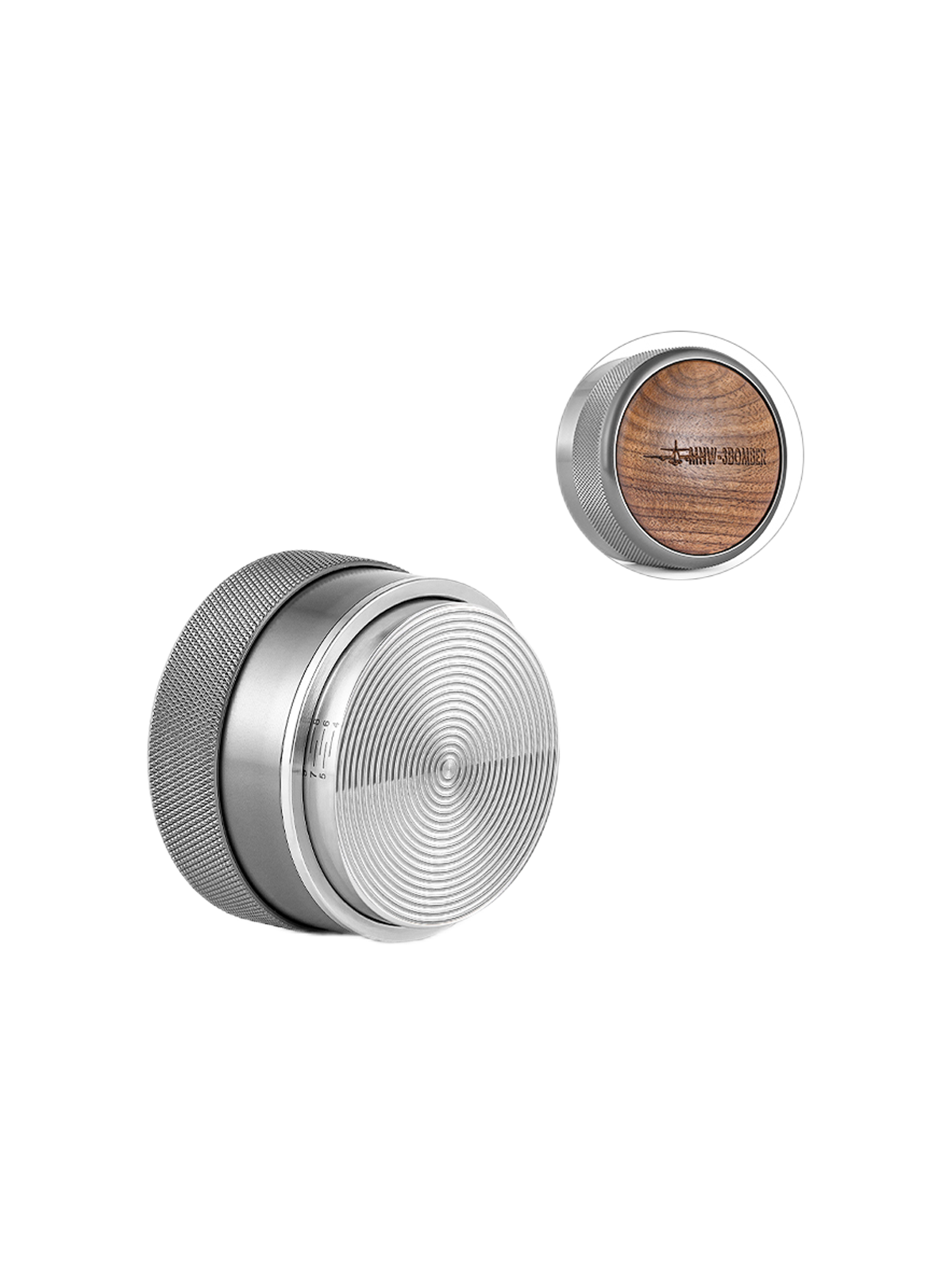 Het handvat combineert aluminium met een visgraatstructuur voor extra grip, terwijl de bovenkant van walnoothout een warme en verfijnde uitstraling geeft. Samen zorgen deze materialen voor een comfortabele bediening en een solide, duurzame tamper.